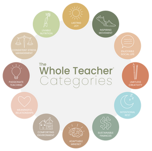 Weeks explore all 12 Whole Teacher categories: stress, nutrition, joy, movement, social life, creativity, rest, finances, mindset, environment, relationships, & teaching.